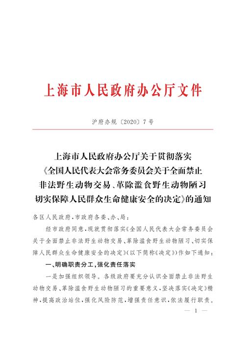 上海市人民政府辦公廳關(guān)于貫徹落實(shí)《全國(guó)人民代表大會(huì)常務(wù)委員會(huì)關(guān)于全面禁止非法野生動(dòng)物交易、革除濫食野生動(dòng)物陋習(xí)切實(shí)保障人民群眾生命健康安全的決定》的通知