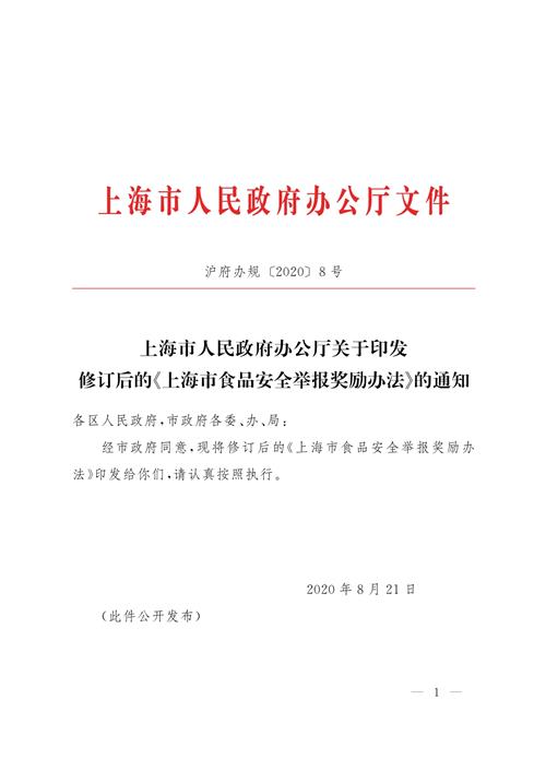 上海市人民政府辦公廳關(guān)于印發(fā)修訂后的《上海市食品安全舉報(bào)獎(jiǎng)勵(lì)辦法》的通知