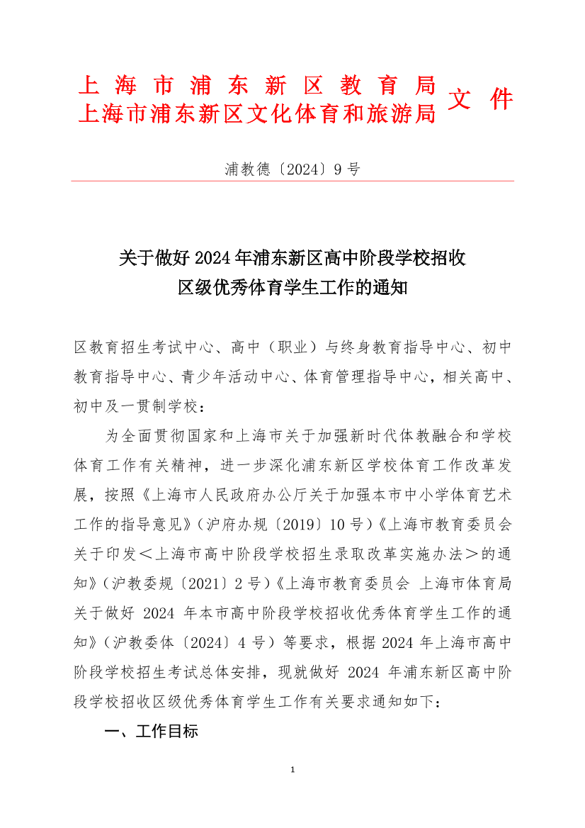 ??為全面貫徹國(guó)家和上海市關(guān)于加強(qiáng)新時(shí)代體教融合和學(xué)校體育工作有關(guān)精神,進(jìn)一步深化浦東新區(qū)學(xué)校體育工作改革發(fā)展,按照《上海市人民政府辦公廳關(guān)于加強(qiáng)本市中小學(xué)體育藝術(shù)工作的指導(dǎo)意見(jiàn)》(滬府辦規(guī)〔2019〕10號(hào))《上海市教育委員會(huì)關(guān)于印發(fā)<上海市高中階段學(xué)校招生錄取改革實(shí)施辦法>的通知》(滬教委規(guī)〔2021〕2號(hào))《上海市教育委員會(huì) 上海市體育局關(guān)于做好2024年本市高中階段學(xué)校招收優(yōu)秀體育學(xué)生工作的通知》(滬教委體〔2024〕4號(hào))等要求,根據(jù)2024年上海市高中階段學(xué)校招生考試總體安排,現(xiàn)就做好2024年浦東新區(qū)高中階段學(xué)校招收區(qū)級(jí)優(yōu)秀體育學(xué)生工作有關(guān)要求通知如下: