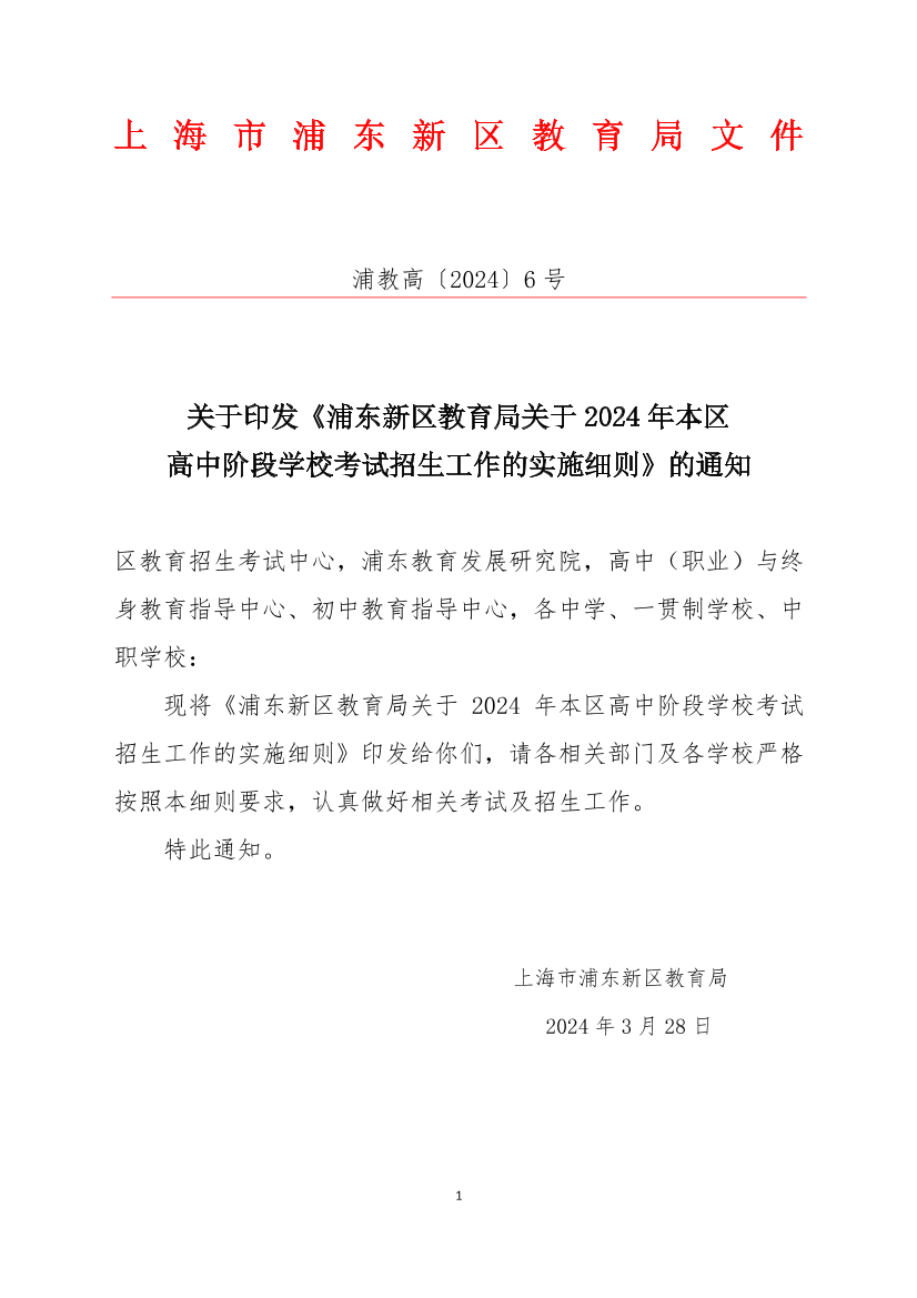 ??現(xiàn)將《浦東新區(qū)教育局關于2024年本區(qū)高中階段學校考試招生工作的實施細則》印發(fā)給你們,請各相關部門及各學校嚴格按照本細則要求,認真做好相關考試及招生工作。
