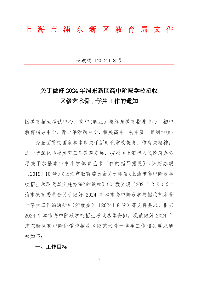 ??為全面貫徹國家和本市關(guān)于新時代學(xué)校美育工作有關(guān)精神,進一步深化學(xué)校美育工作改革發(fā)展,按照《上海市人民政府辦公廳關(guān)于加強本市中小學(xué)體育藝術(shù)工作的指導(dǎo)意見》(滬府辦規(guī)〔2019〕10號)《上海市教育委員會關(guān)于印發(fā)<上海市高中階段學(xué)校招生錄取改革實施辦法>的通知》(滬教委規(guī)〔2021〕2號)《上海市教育委員會關(guān)于做好2024年本市高中階段學(xué)校招收藝術(shù)骨干學(xué)生工作的通知》(滬教委體〔2024〕8號)等文件要求,根據(jù)2024年本市高中階段學(xué)校招生考試總體安排,現(xiàn)就做好2024年浦東新區(qū)高中階段學(xué)校招收區(qū)級藝術(shù)骨干學(xué)生工作相關(guān)要求通知如下: