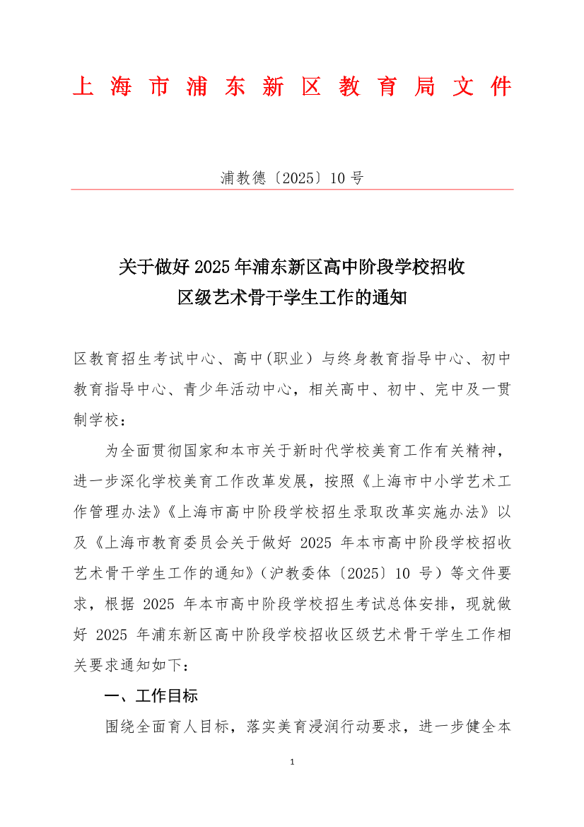 ??為全面貫徹國家和本市關(guān)于新時代學(xué)校美育工作有關(guān)精神,進(jìn)一步深化學(xué)校美育工作改革發(fā)展,按照《上海市中小學(xué)藝術(shù)工作管理辦法》《上海市高中階段學(xué)校招生錄取改革實施辦法》以及《上海市教育委員會關(guān)于做好2025年本市高中階段學(xué)校招收藝術(shù)骨干學(xué)生工作的通知》(滬教委體〔2025〕10號)等文件要求,根據(jù)2025年本市高中階段學(xué)校招生考試總體安排,現(xiàn)就做好2025年浦東新區(qū)高中階段學(xué)校招收區(qū)級藝術(shù)骨干學(xué)生工作相關(guān)要求通知如下: