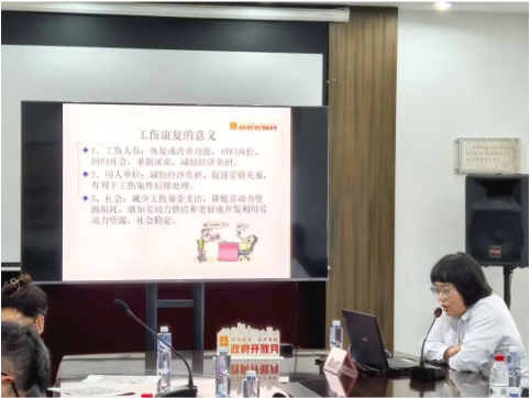 座談會上,普陀區(qū)康復(fù)醫(yī)院向受邀代表介紹未來普陀區(qū)康復(fù)醫(yī)院科室設(shè)置、醫(yī)療人員配備規(guī)劃及特色技術(shù)。同時,從醫(yī)學(xué)專業(yè)角度向受邀代表介紹工傷康復(fù)的重要性和必要性。區(qū)人社局向受邀代表介紹業(yè)務(wù)辦理依據(jù)、申請條件、申請流程等勞動能力鑒定及住院工傷康復(fù)相關(guān)政策內(nèi)容,認真聽取受邀代表提出的問題及意見建議,并一一作出回應(yīng),獲得受邀代表的一致好評。