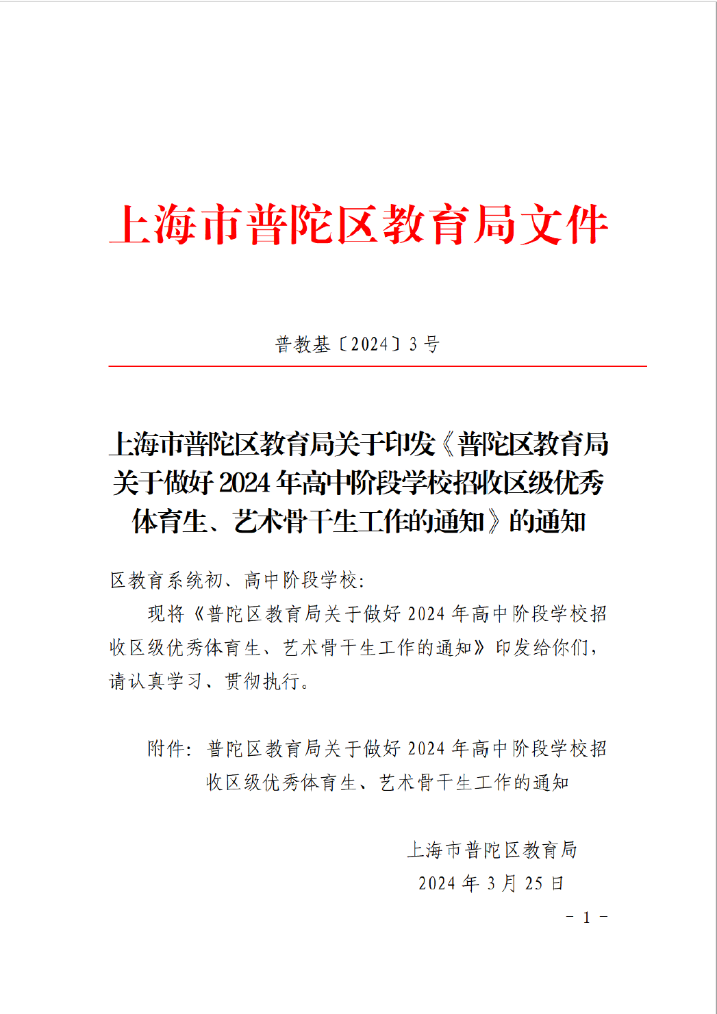 ??附件:普陀區(qū)教育局關于做好2024年高中階段學校招收區(qū)級優(yōu)秀體育生、藝術(shù)骨干生工作的通知