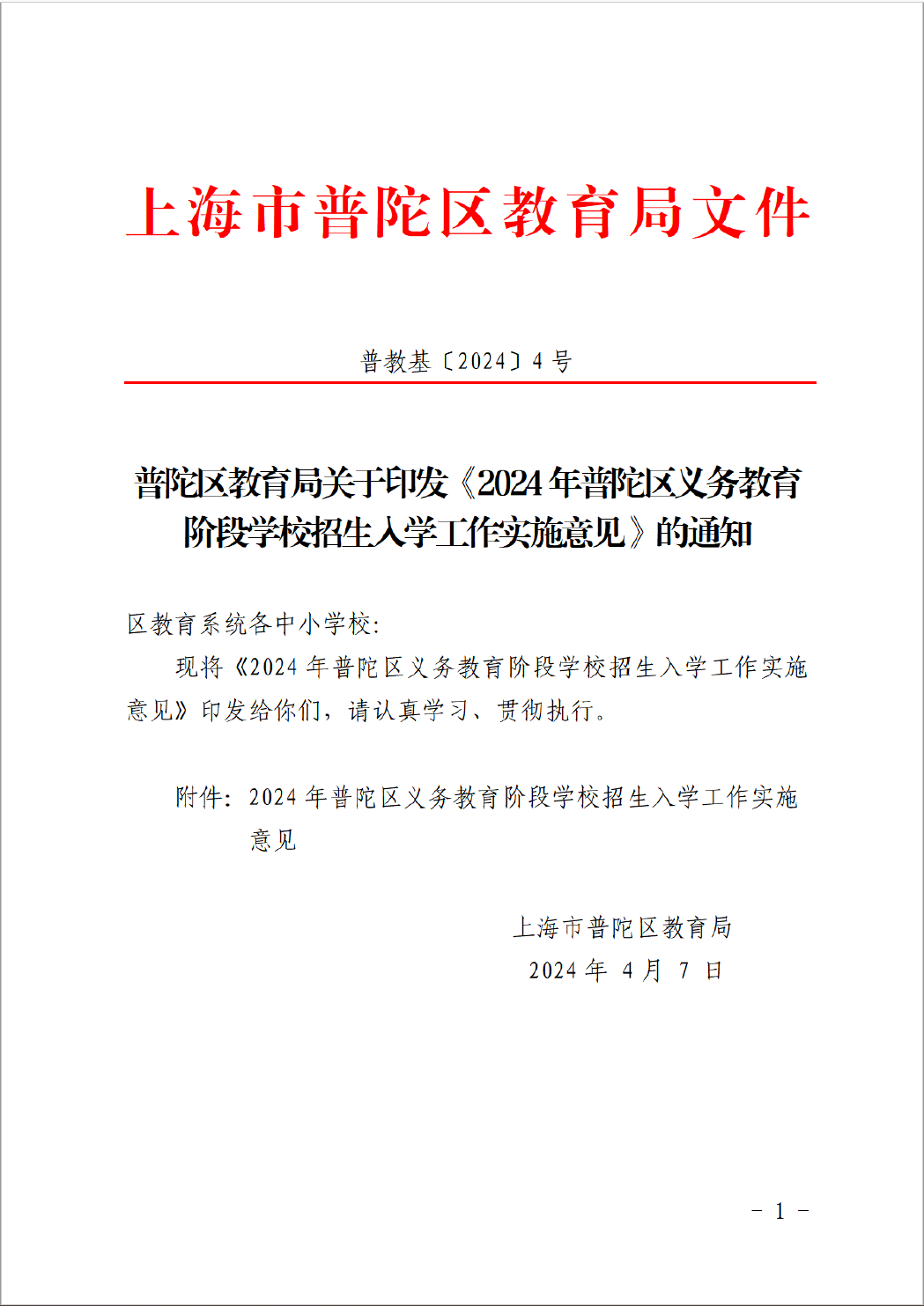 ??現(xiàn)將《2024年普陀區(qū)義務(wù)教育階段學(xué)校招生入學(xué)工作實施意見》印發(fā)給你們,請認(rèn)真學(xué)習(xí)、貫徹執(zhí)行。