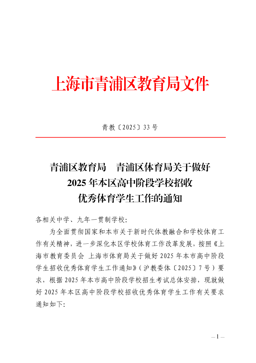 ??為全面貫徹國家和本市關(guān)于新時(shí)代體教融合和學(xué)校體育工作有關(guān)精神,進(jìn)一步深化本區(qū)學(xué)校體育工作改革發(fā)展,按照《上海市教育委員會(huì)上海市體育局關(guān)于做好2025年本市高中階段學(xué)生招收優(yōu)秀體育學(xué)生工作通知》(滬教委體〔2025〕7號(hào))要求,根據(jù)2025年本市高中階段學(xué)校招生考試總體安排,現(xiàn)就做好2025年本區(qū)高中階段學(xué)校招收優(yōu)秀體育學(xué)生工作有關(guān)要求通知如下: