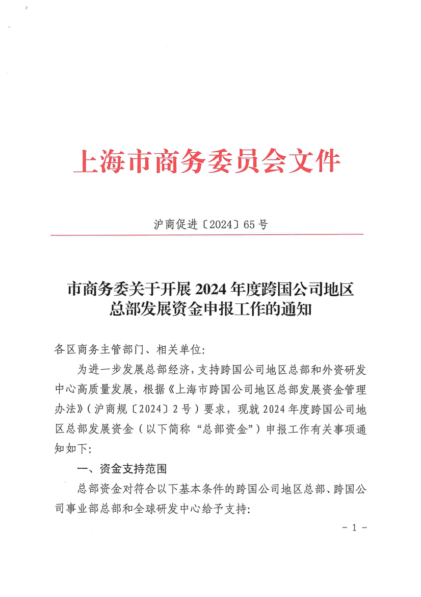 ??為進(jìn)一步發(fā)展總部經(jīng)濟(jì),支持跨國公司地區(qū)總部和外資研發(fā)中心高質(zhì)量發(fā)展,根據(jù)《上海市跨國公司地區(qū)總部發(fā)展資金管理辦法》(滬商規(guī)〔2024〕2號(hào))要求,現(xiàn)就2024年度跨國公司地區(qū)總部發(fā)展資金(以下簡稱“總部資金”)申報(bào)工作有關(guān)事項(xiàng)通知如下: