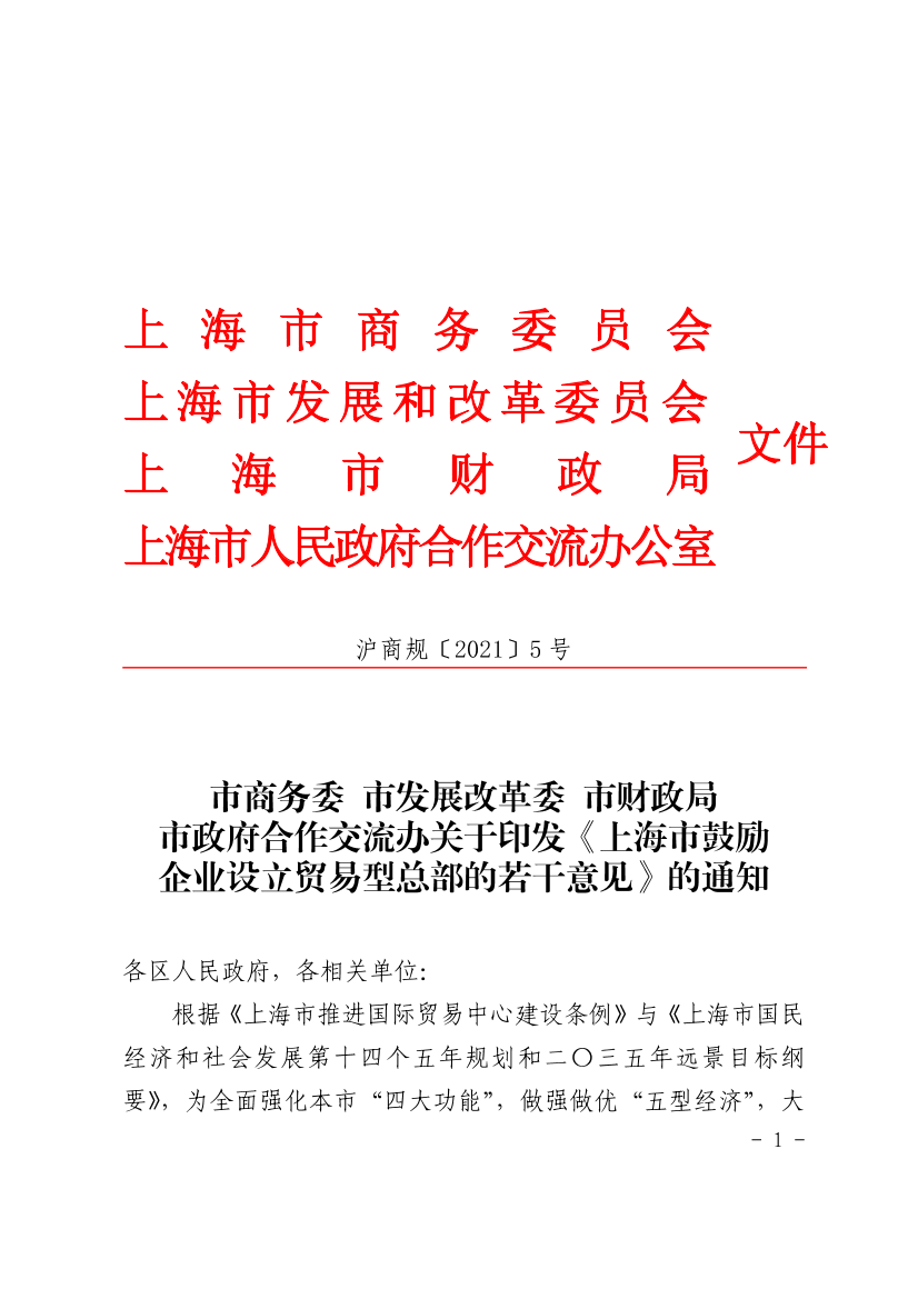 ??根據(jù)《上海市推進國際貿(mào)易中心建設(shè)條例》與《上海市國民經(jīng)濟和社會發(fā)展第十四個五年規(guī)劃和二〇三五年遠景目標(biāo)綱要》,為全面強化本市“四大功能”,做強做優(yōu)“五型經(jīng)濟”,大力發(fā)展具有全球影響力的總部型經(jīng)濟,進一步集聚培育更多多功能、高能級的國內(nèi)外貿(mào)易企業(yè)總部,支持貿(mào)易領(lǐng)域頭部企業(yè)做大做強,市商務(wù)委會同市發(fā)展改革委、市財政局、市政府合作交流辦等部門,制定了《上海市鼓勵企業(yè)設(shè)立貿(mào)易型總部的若干意見》,現(xiàn)印發(fā)給你們,請按照執(zhí)行。