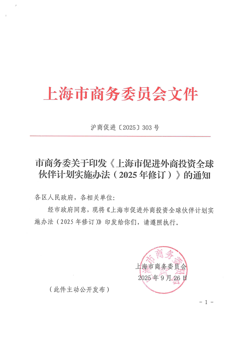 上海市促進外商投資全球伙伴計劃實施辦法(2025年修訂)