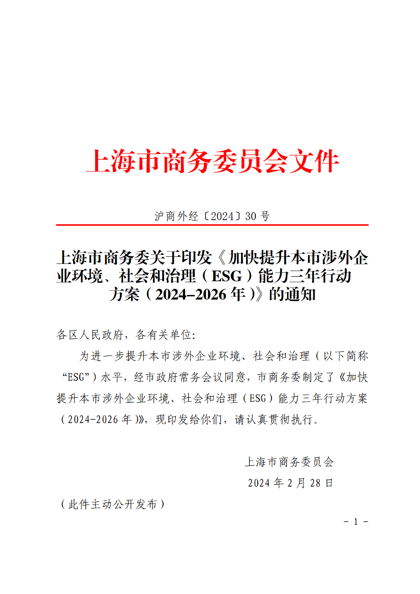 ??為進一步提升本市涉外企業(yè)環(huán)境、社會和治理(以下簡稱“ESG”)水平,經(jīng)市政府常務(wù)會議同意,市商務(wù)委制定了《加快提升本市涉外企業(yè)環(huán)境、社會和治理(ESG)能力三年行動方案(2024-2026年)》,現(xiàn)印發(fā)給你們,請認真貫徹執(zhí)行。