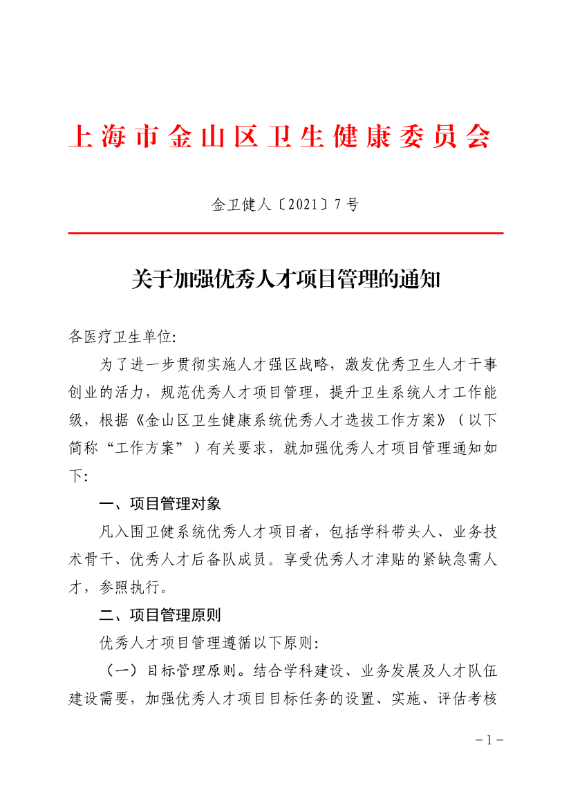 為了進一步貫徹實施人才強區(qū)戰(zhàn)略,激發(fā)優(yōu)秀衛(wèi)生人才干事創(chuàng)業(yè)的活力,規(guī)范優(yōu)秀人才項目管理,提升衛(wèi)生系統(tǒng)人才工作能級,根據(jù)《金山區(qū)衛(wèi)生健康系統(tǒng)優(yōu)秀人才選拔工作方案》(以下簡稱“工作方案”)有關要求,就加強優(yōu)秀人才項目管理通知如下: