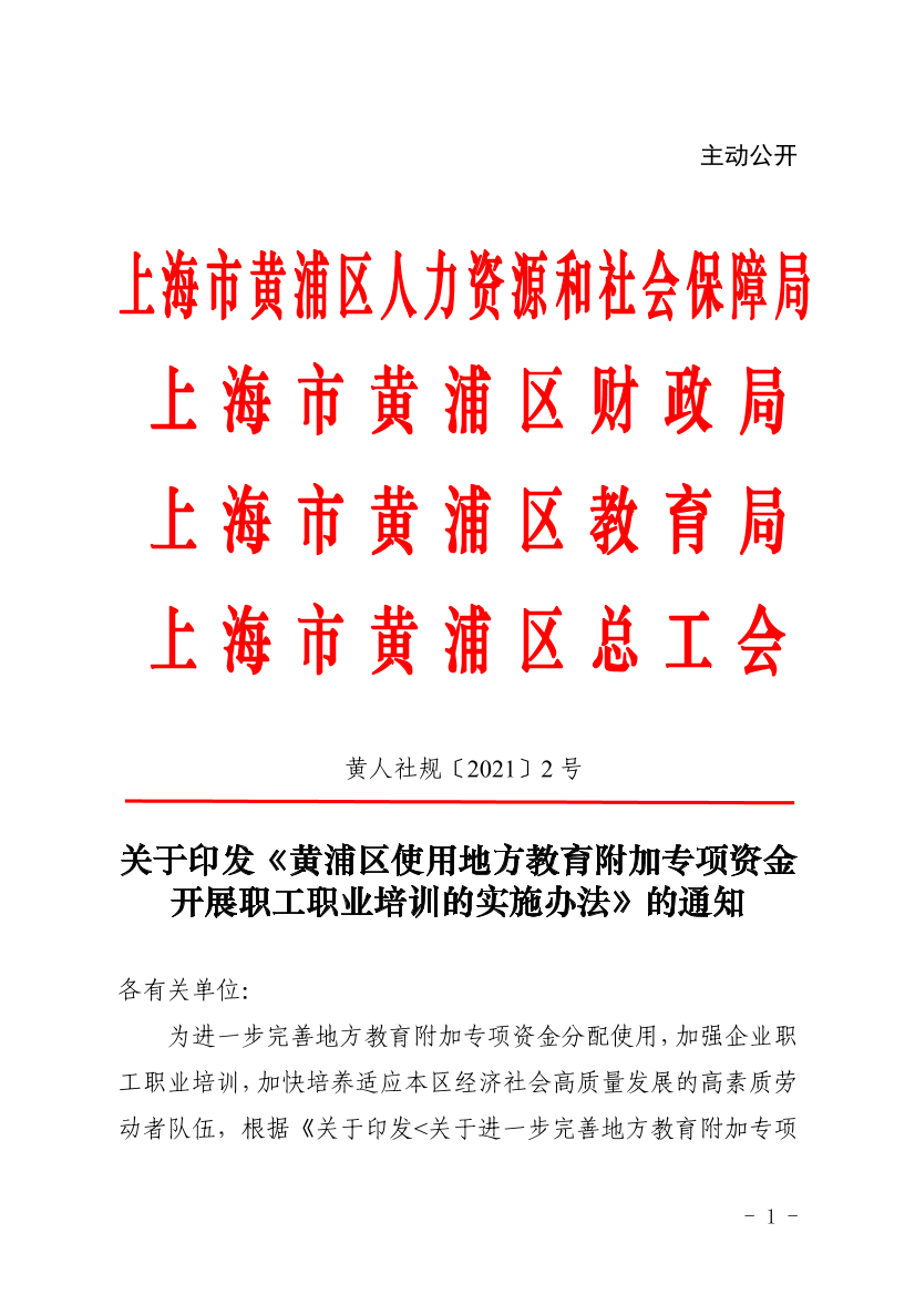 ??為進(jìn)一步完善地方教育附加專項資金分配使用,加強企業(yè)職工職業(yè)培訓(xùn),加快培養(yǎng)適應(yīng)本區(qū)經(jīng)濟社會高質(zhì)量發(fā)展的高素質(zhì)勞動者隊伍,根據(jù)《關(guān)于印發(fā)<關(guān)于進(jìn)一步完善地方教育附加專項資金分配使用辦法加強企業(yè)職工職業(yè)培訓(xùn)的實施意見>的通知》(滬財發(fā)〔2020〕7號)和《上海市人力資源和社會保障局等四部門關(guān)于各區(qū)使用地方教育附加專項資金開展職工職業(yè)培訓(xùn)工作的指導(dǎo)意見》(滬人社職〔2021〕51號),現(xiàn)將《黃浦區(qū)使用地方教育附加專項資金開展職工職業(yè)培訓(xùn)的實施辦法》印發(fā)給你們,請遵照執(zhí)行。