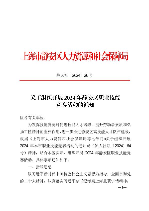 ??為發(fā)揮技能競賽對促進技能人才培養(yǎng)、提升勞動者素質(zhì)和弘揚工匠精神的重要作用,進一步推進靜安區(qū)高技能人才隊伍建設(shè),根據(jù)《上海市人力資源和社會保障局等七部門<關(guān)于組織開展 2024年本市職業(yè)技能競賽活動的通知>》(滬人社職〔2024〕64號)精神,結(jié)合本區(qū)實際,組織開展 2024年靜安區(qū)職業(yè)技能競賽活動。具體事項通知如下: