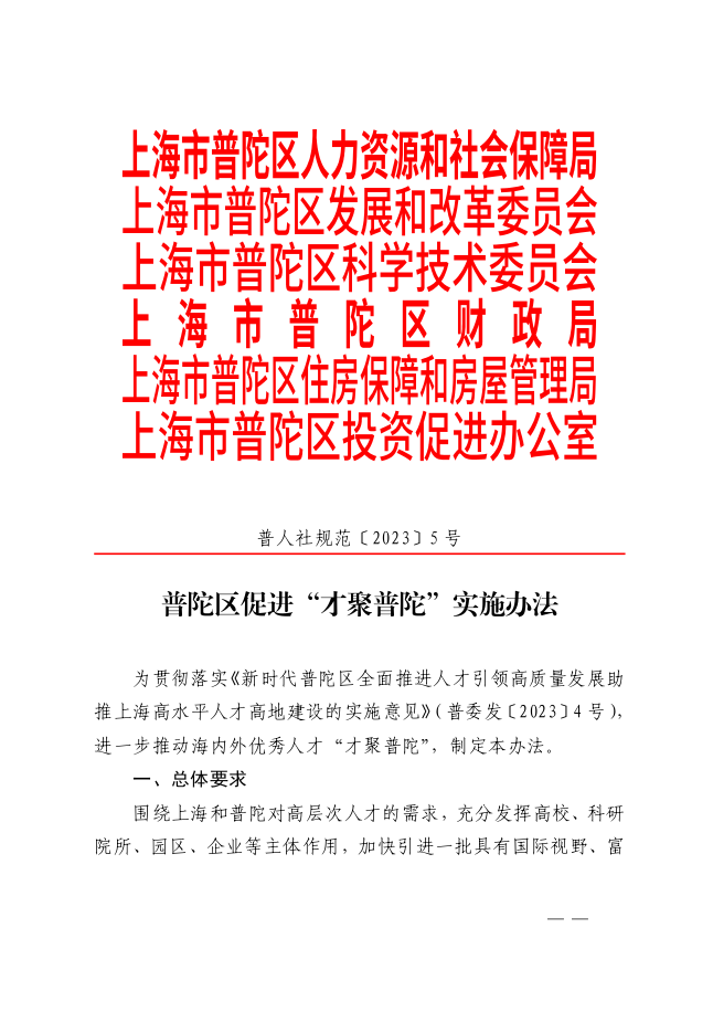 ??為貫徹落實《新時代普陀區(qū)全面推進人才引領高質量發(fā)展助推上海高水平人才高地建設的實施意見》(普委發(fā)〔2023〕4號),進一步推動海內外優(yōu)秀人才“才聚普陀”,制定本辦法。