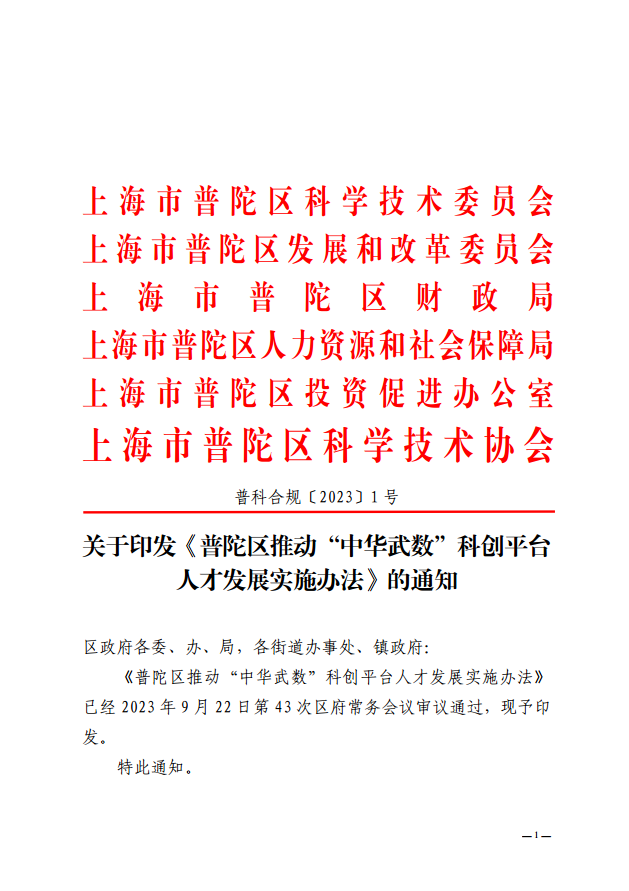 普陀區(qū)推動“中華武數(shù)”科創(chuàng)平臺人才發(fā)展實施辦法