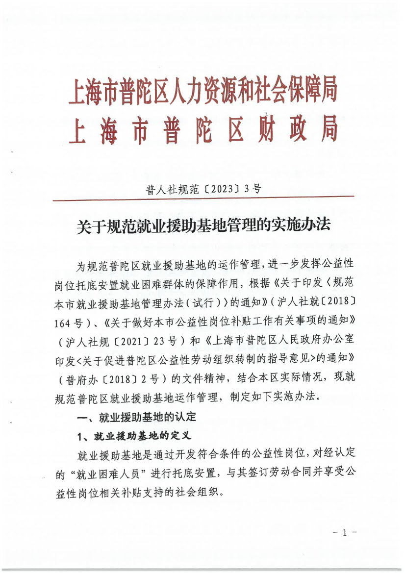 ??為規(guī)范普陀區(qū)就業(yè)援助基地的運(yùn)作管理,進(jìn)一步發(fā)揮公益性崗位托底安置就業(yè)困難群體的保障作用,根據(jù)《關(guān)于印發(fā)〈規(guī)范本市就業(yè)援助基地管理辦法(試行)〉的通知》(滬人社就〔2018〕164號)、《關(guān)于做好本市公益性崗位補(bǔ)貼工作有關(guān)事項(xiàng)的通知》(滬人社規(guī)〔2021〕23號)和《上海市普陀區(qū)人民政府辦公室印發(fā)<關(guān)于促進(jìn)普陀區(qū)公益性勞動組織轉(zhuǎn)制的指導(dǎo)意見>的通知》(普府辦〔2018〕2號)的文件精神,結(jié)合本區(qū)實(shí)際情況,現(xiàn)就規(guī)范普陀區(qū)就業(yè)援助基地運(yùn)作管理,制定如下實(shí)施辦法。