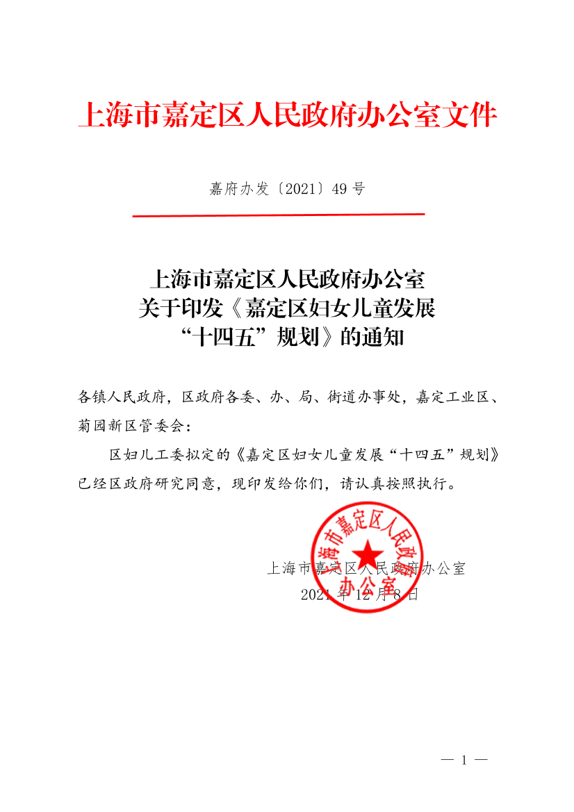 上海市嘉定區(qū)人民政府辦公室關(guān)于印發(fā)《嘉定區(qū)婦女兒童發(fā)展“十四五”規(guī)劃》的通知