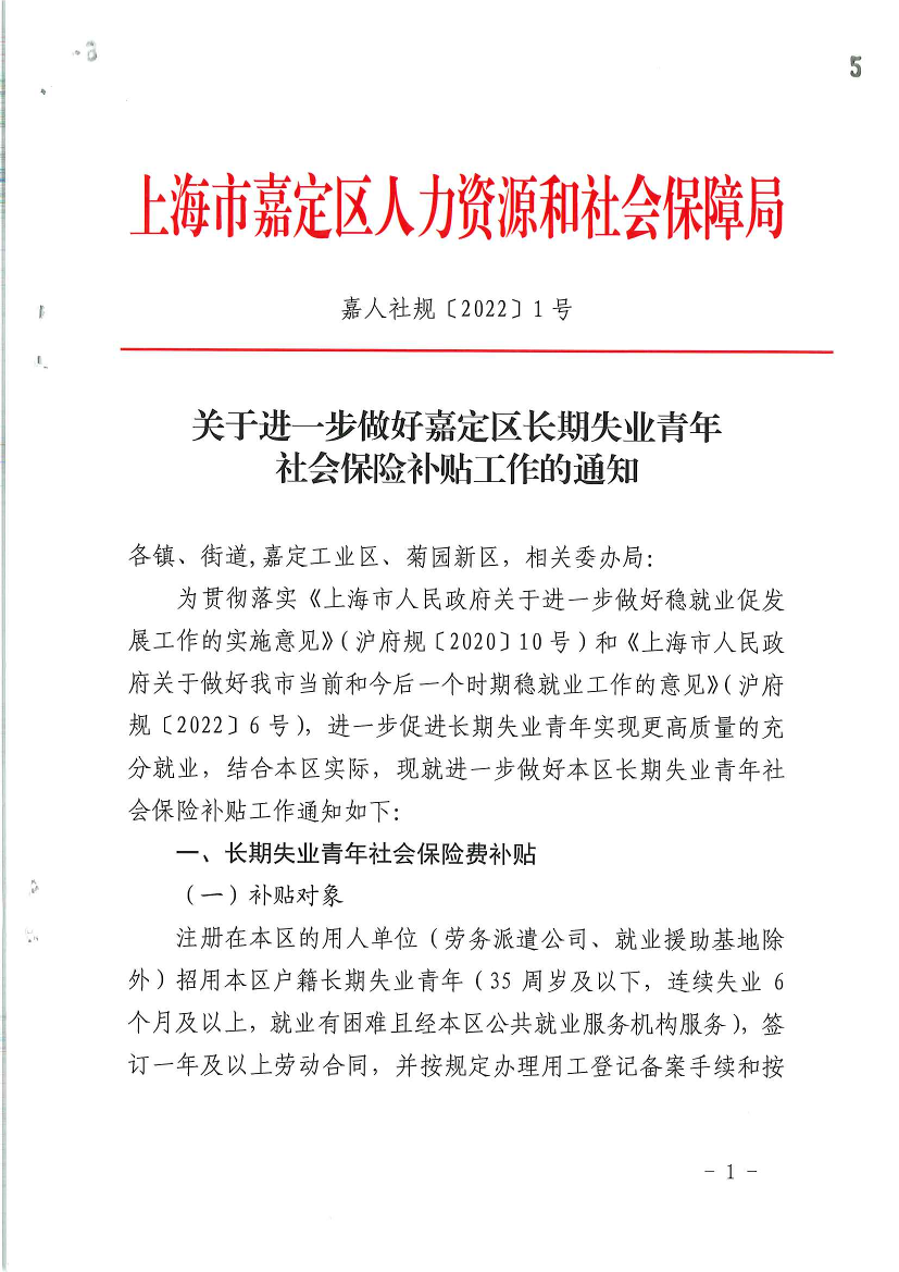 ??為貫徹落實(shí)《上海市人民政府關(guān)于進(jìn)一步做好穩(wěn)就業(yè)促發(fā)展工作的實(shí)施意見》(滬府規(guī)〔2020〕10號)和《上海市人民政府關(guān)于做好我市當(dāng)前和今后一個時期穩(wěn)就業(yè)工作的意見》(滬府規(guī)〔2022〕6號),進(jìn)一步促進(jìn)長期失業(yè)青年實(shí)現(xiàn)更高質(zhì)量的充分就業(yè),結(jié)合本區(qū)實(shí)際,現(xiàn)就進(jìn)一步做好本區(qū)長期失業(yè)青年社會保險補(bǔ)貼工作通知如下: