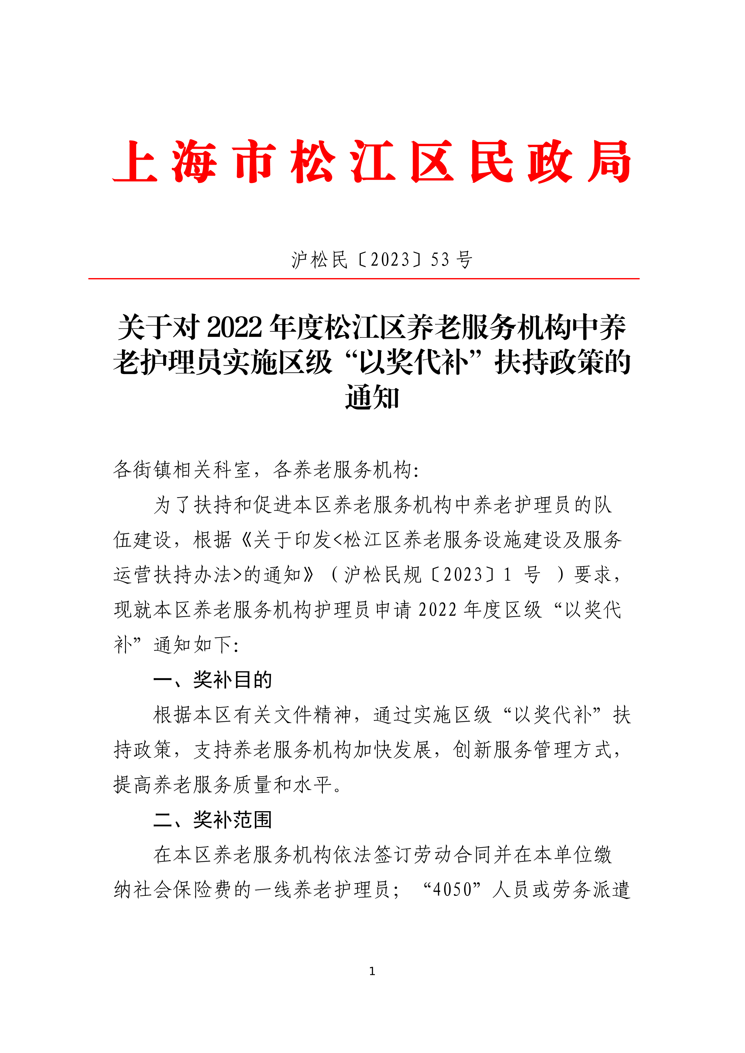 關于對2022年度松江區(qū)養(yǎng)老服務機構中養(yǎng)老護理員實施區(qū)級“以獎代補”扶持政策的通知