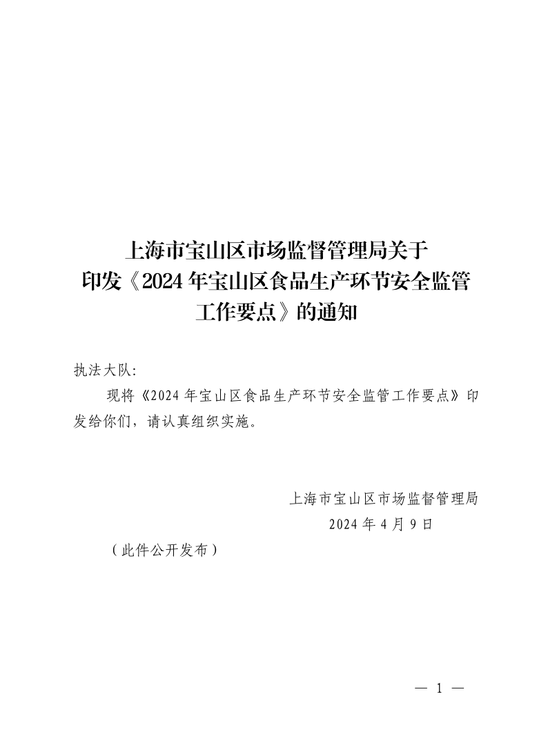 上海市寶山區(qū)市場監(jiān)督管理局關(guān)于印發(fā)《2024年寶山區(qū)食品生產(chǎn)環(huán)節(jié)安全監(jiān)管工作要點(diǎn)》的通知