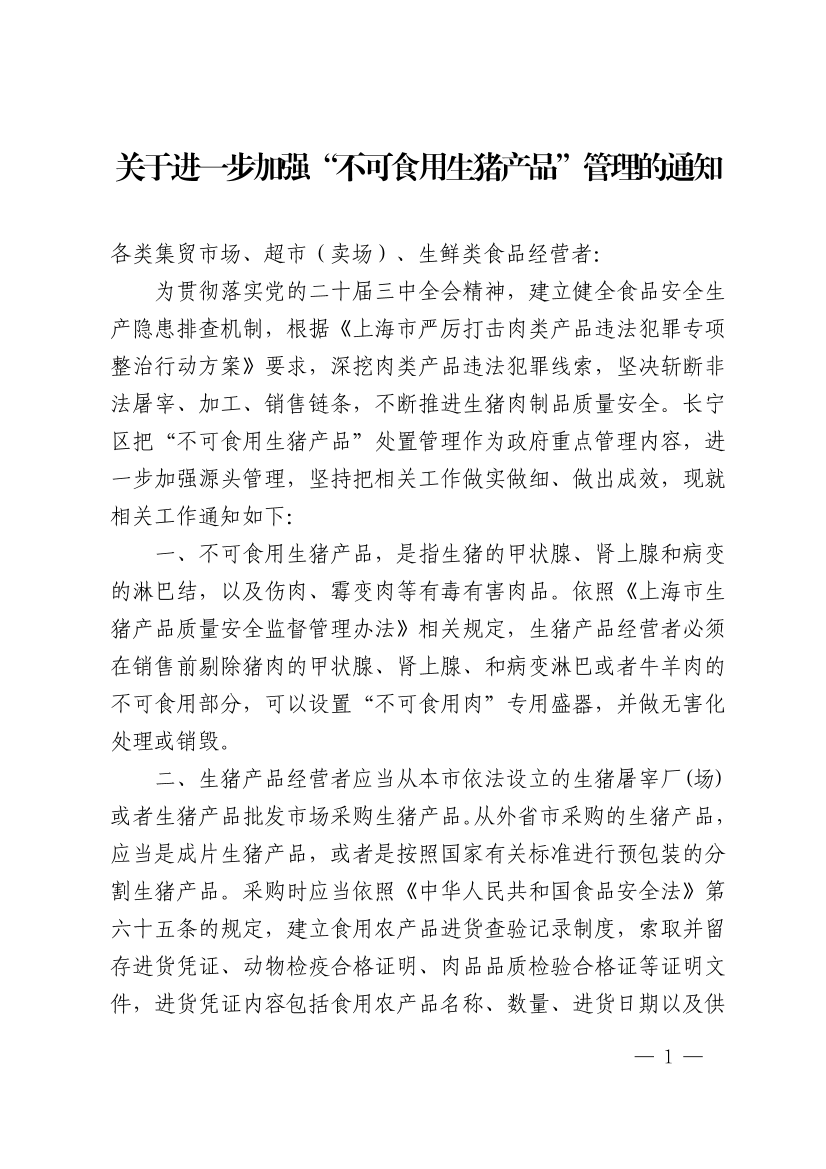 為貫徹落實(shí)黨的二十屆三中全會(huì)精神,建立健全食品安全生產(chǎn)隱患排查機(jī)制,根據(jù)《上海市嚴(yán)厲打擊肉類(lèi)產(chǎn)品違法犯罪專(zhuān)項(xiàng)整治行動(dòng)方案》要求,深挖肉類(lèi)產(chǎn)品違法犯罪線索,堅(jiān)決斬?cái)喾欠ㄍ涝?、加工、銷(xiāo)售鏈條,不斷推進(jìn)生豬肉制品質(zhì)量安全。長(zhǎng)寧區(qū)把“不可食用生豬產(chǎn)品”處置管理作為政府重點(diǎn)管理內(nèi)容,進(jìn)一步加強(qiáng)源頭管理,堅(jiān)持把相關(guān)工作做實(shí)做細(xì)、做出成效,現(xiàn)就相關(guān)工作通知如下: