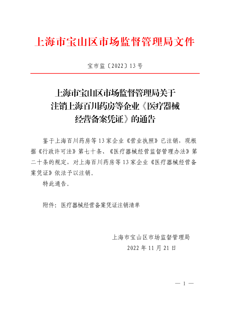 ??鑒于上海百川藥房等13家企業(yè)《營業(yè)執(zhí)照》已注銷,現(xiàn)根據(jù)《行政許可法》第七十條、《醫(yī)療器械經(jīng)營監(jiān)督管理辦法》第二十條的規(guī)定,對上海百川藥房等13家企業(yè)《醫(yī)療器械經(jīng)營備案憑證》依法予以注銷。