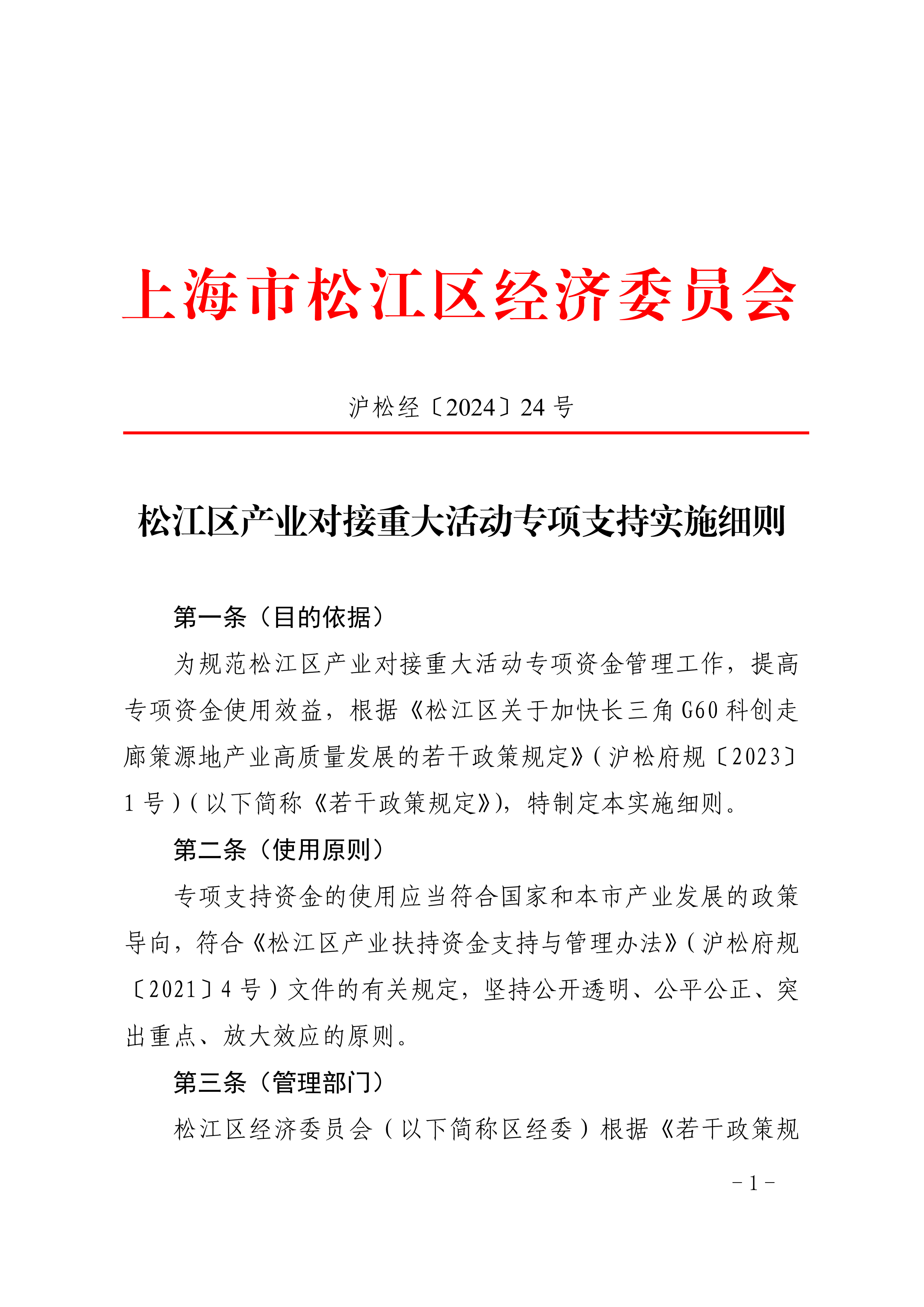 ??為規(guī)范松江區(qū)產(chǎn)業(yè)對(duì)接重大活動(dòng)專項(xiàng)資金管理工作,提高專項(xiàng)資金使用效益,根據(jù)《松江區(qū)關(guān)于加快長(zhǎng)三角G60科創(chuàng)走廊策源地產(chǎn)業(yè)高質(zhì)量發(fā)展的若干政策規(guī)定》(滬松府規(guī)〔2023〕1號(hào))(以下簡(jiǎn)稱《若干政策規(guī)定》),特制定本實(shí)施細(xì)則。