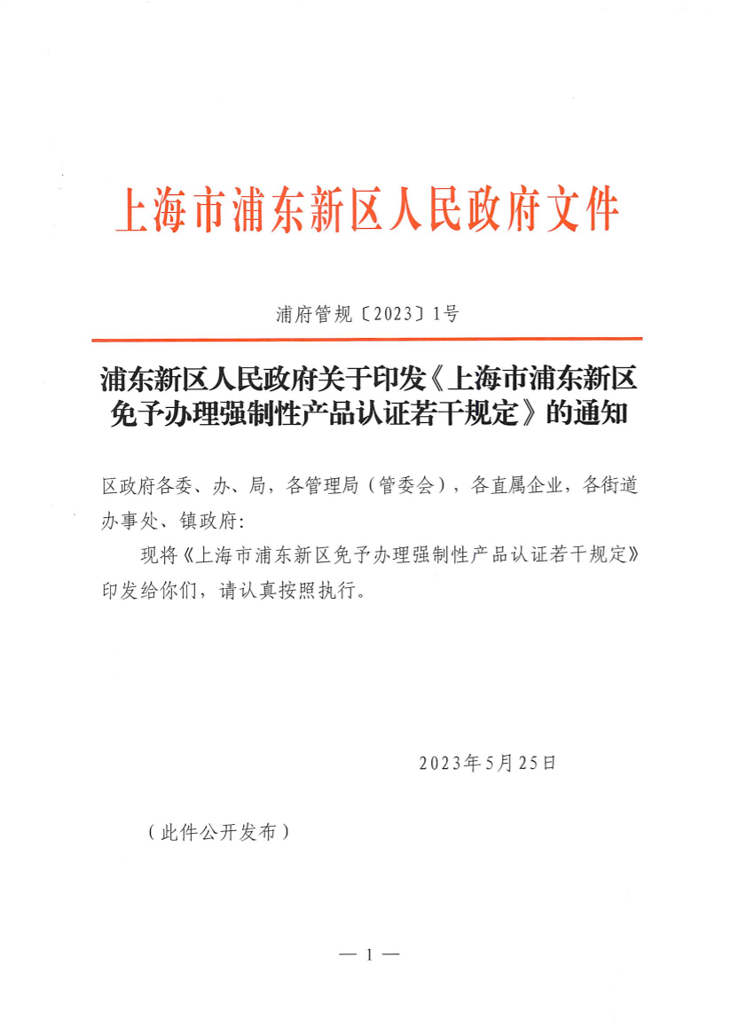 浦東新區(qū)人民政府關(guān)于印發(fā)《上海市浦東新區(qū)免予辦理強(qiáng)制性產(chǎn)品認(rèn)證若干規(guī)定》的通知