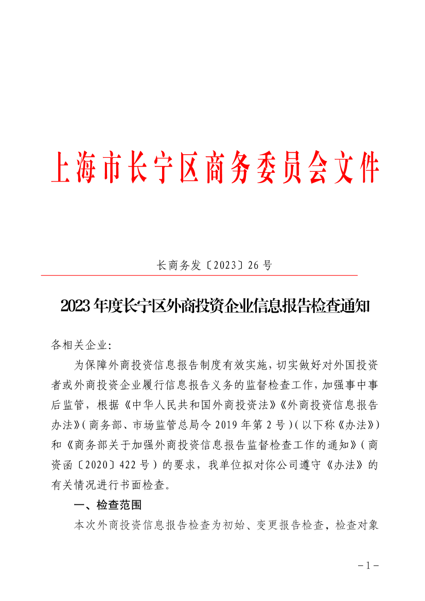 2023年度長(zhǎng)寧區(qū)外商投資企業(yè)信息報(bào)告檢查通知