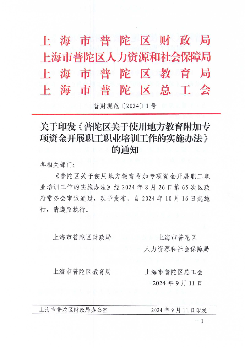 ??《普陀區(qū)關(guān)于使用地方教育附加專項資金開展職工職業(yè)培訓(xùn)工作的實施辦法》經(jīng)2024年8月26日第65次區(qū)政府常務(wù)會審議通過,現(xiàn)予發(fā)布,自2024年10月16日起施行,請遵照執(zhí)行。