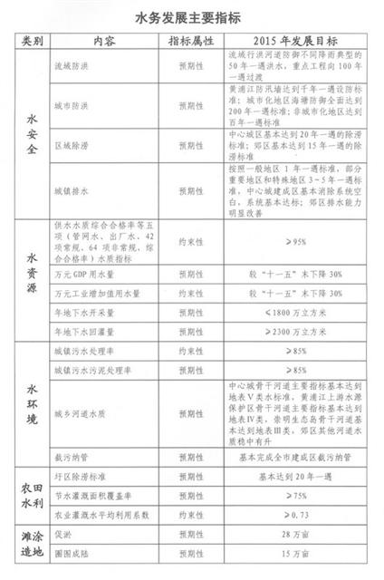 規(guī)劃確定水安全、水資源、水環(huán)境、農田水利、灘涂造地等五類17項定性定量指標。其中,供水水質綜合合格率、城鎮(zhèn)污水處理率、萬元工業(yè)增加值用水量下降值、農業(yè)灌溉水利用系數(shù)4項為約束性指標,其余為預期性指標。具體為: