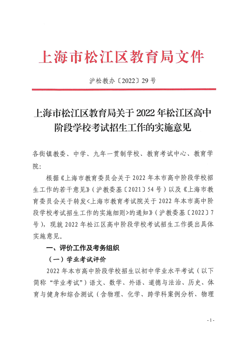 2022年松江區(qū)高中階段學??荚囌猩ぷ鲗嵤┮庖?/strong>