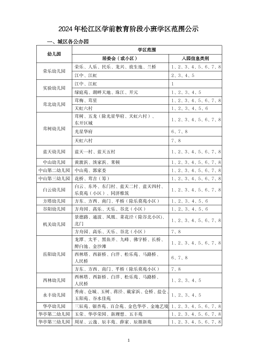 2024年松江區(qū)學(xué)前教育階段小班學(xué)區(qū)范圍公示