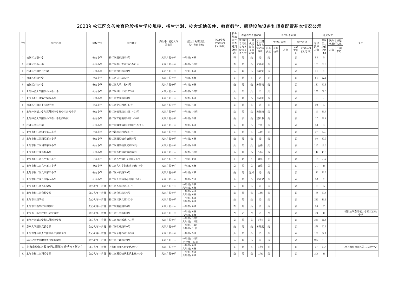 | 2023年松江區(qū)義務(wù)教育階段招生學(xué)校規(guī)模、招生計(jì)劃、校舍場(chǎng)地條件、教育教學(xué)、后勤設(shè)施設(shè)備和師資配置基本情況公示 | ||||||||||||||||||||