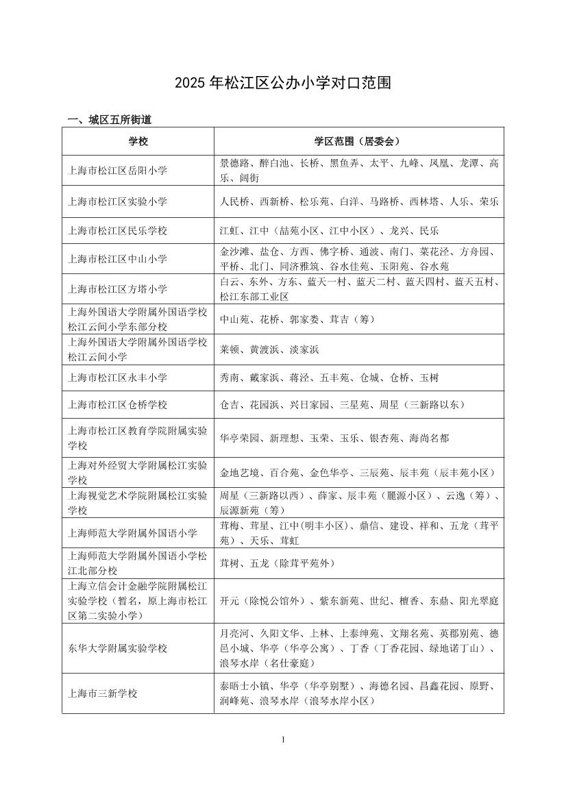 2025年松江區(qū)公辦小學(xué)對(duì)口范圍