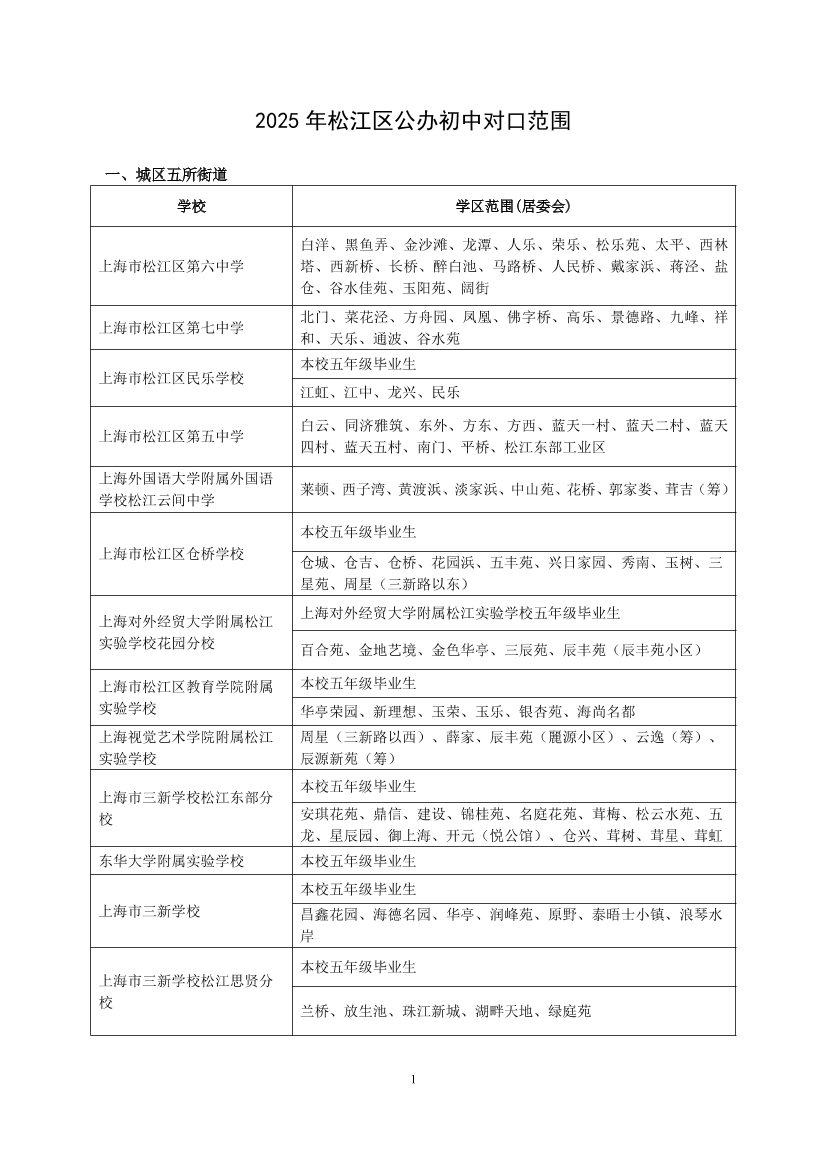 2025年松江區(qū)公辦初中對(duì)口范圍