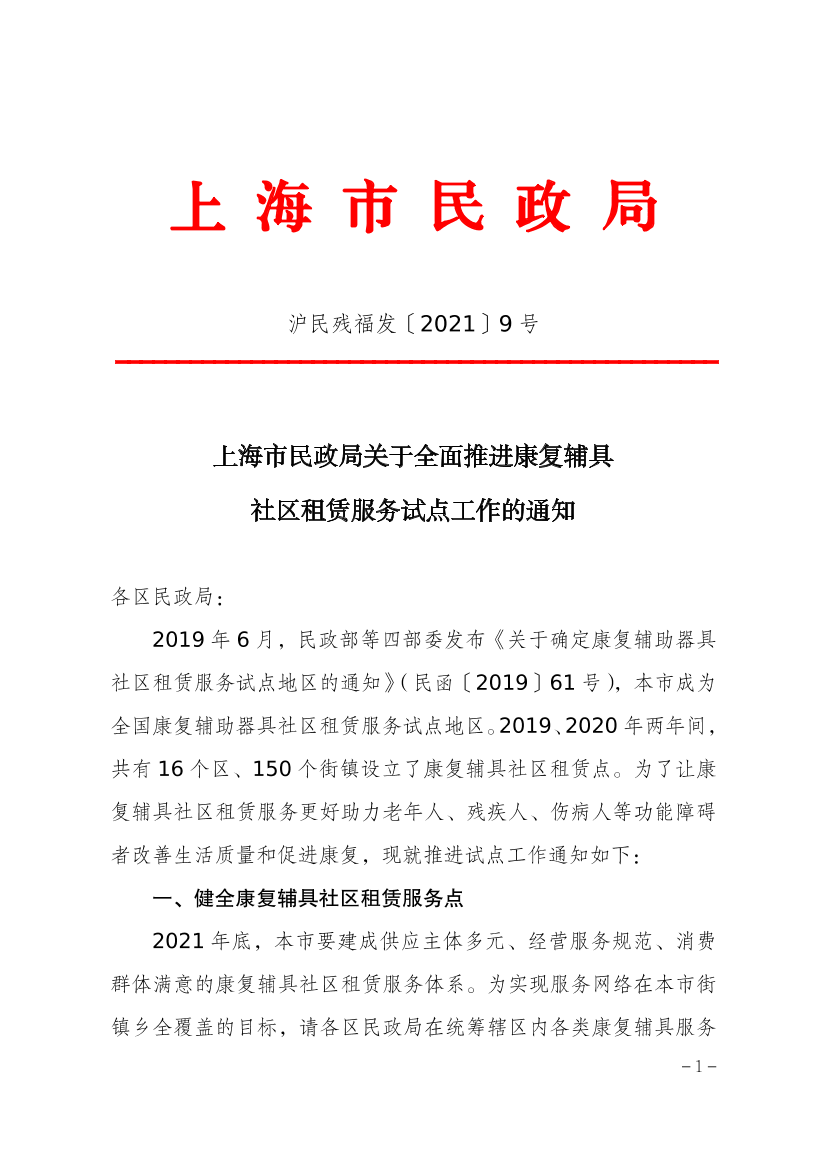 ??2019年6月,民政部等四部委發(fā)布《關于確定康復輔助器具社區(qū)租賃服務試點地區(qū)的通知》(民函〔2019〕61號),本市成為全國康復輔助器具社區(qū)租賃服務試點地區(qū)。2019、2020年兩年間,共有16個區(qū)、150個街鎮(zhèn)設立了康復輔具社區(qū)租賃點。為了讓康復輔具社區(qū)租賃服務更好助力老年人、殘疾人、傷病人等功能障礙者改善生活質量和促進康復,現就推進試點工作通知如下: