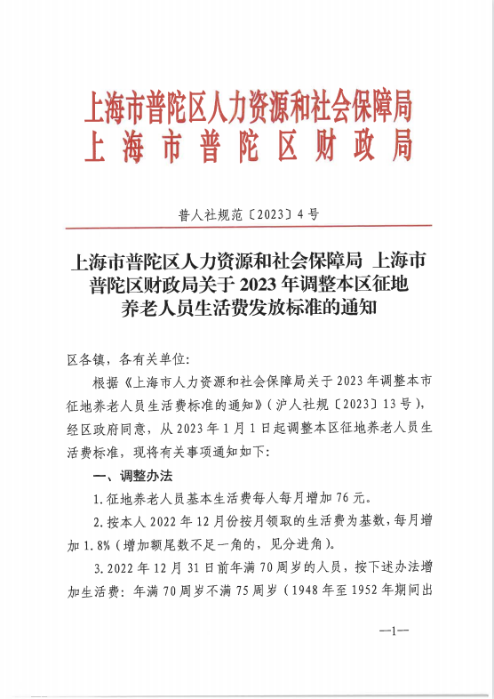 ??根據(jù)《上海市人力資源和社會保障局關(guān)于2023年調(diào)整本市征地養(yǎng)老人員生活費標準的通知》(滬人社規(guī)〔2023〕13號),經(jīng)區(qū)政府同意,從2023年1月1日起調(diào)整本區(qū)征地養(yǎng)老人員生活費標準,現(xiàn)將有關(guān)事項通知如下: