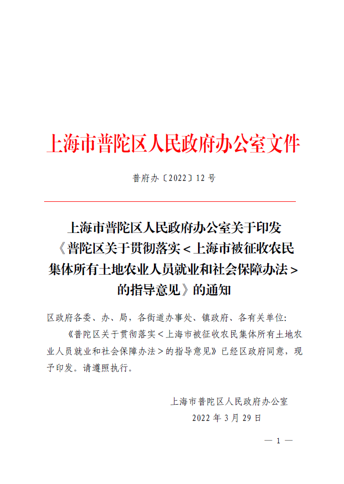 普陀區(qū)關(guān)于貫徹落實(shí)《上海市被征收農(nóng)民集體所有土地農(nóng)業(yè)人員就業(yè)和社會(huì)保障辦法》的指導(dǎo)意見(jiàn)