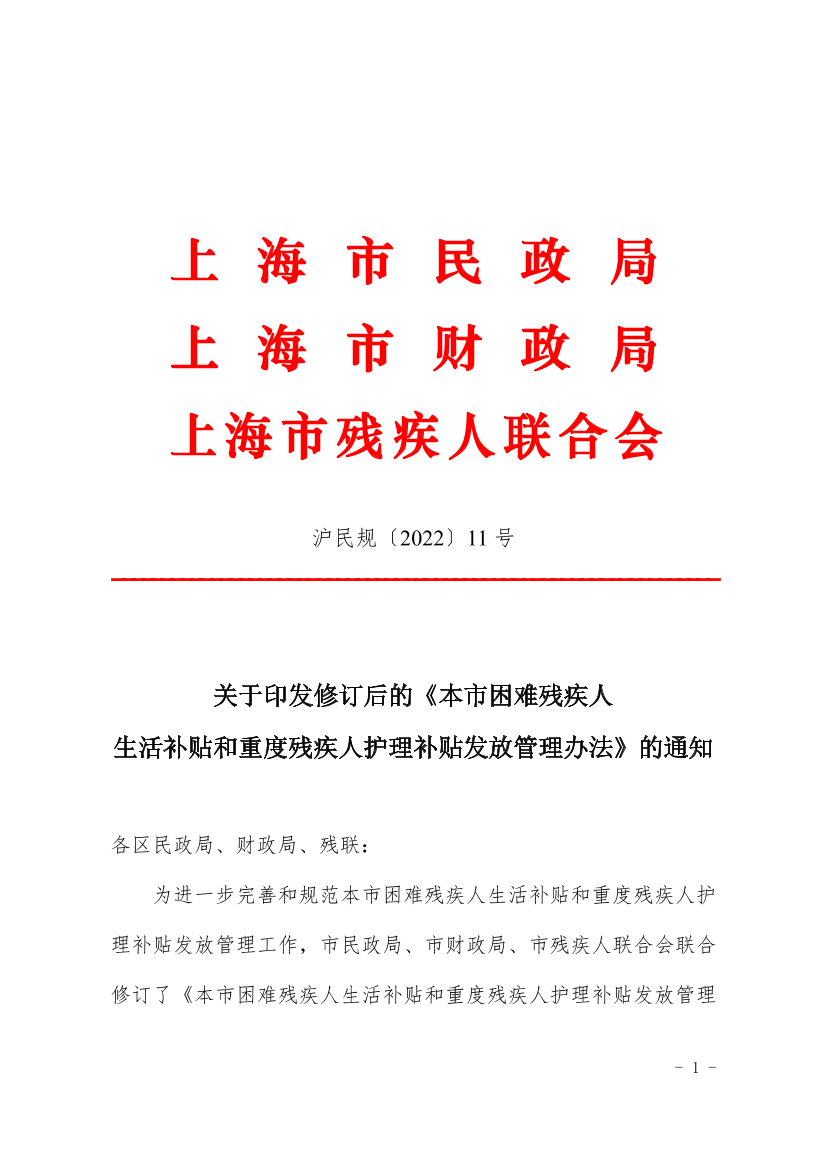 ??為進(jìn)一步完善和規(guī)范本市困難殘疾人生活補(bǔ)貼和重度殘疾人護(hù)理補(bǔ)貼發(fā)放管理工作,市民政局、市財(cái)政局、市殘疾人聯(lián)合會(huì)聯(lián)合修訂了《本市困難殘疾人生活補(bǔ)貼和重度殘疾人護(hù)理補(bǔ)貼發(fā)放管理辦法》?,F(xiàn)印發(fā)給你們,請(qǐng)認(rèn)真遵照?qǐng)?zhí)行。