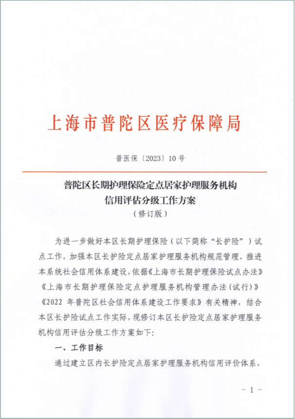 ??為進一步做好本區(qū)長期護理保險(以下簡稱“長護險”)試點工作,加強本區(qū)長護險定點居家護理服務機構規(guī)范管理,推進本系統(tǒng)社會信用體系建設,依據《上海市長期護理保險試點辦法》《上海市長期護理保險定點護理服務機構管理辦法(試行)》《2022年普陀區(qū)社會信用體系建設工作要求》有關精神,結合本區(qū)長護險試點工作實際,現修訂本區(qū)長護險定點居家護理服務機構信用評估分級工作方案如下: