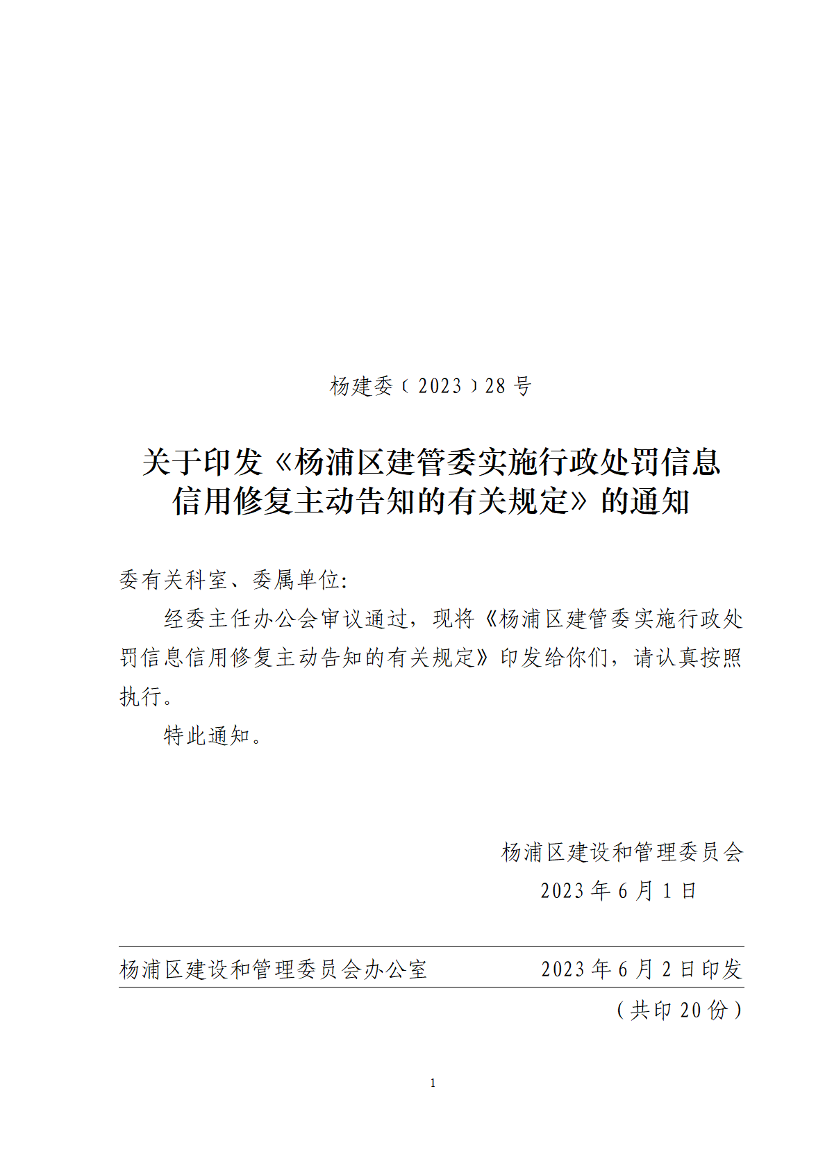 關(guān)于印發(fā)《楊浦區(qū)建管委實(shí)施行政處罰信息信用修復(fù)主動(dòng)告知的有關(guān)規(guī)定》的通知