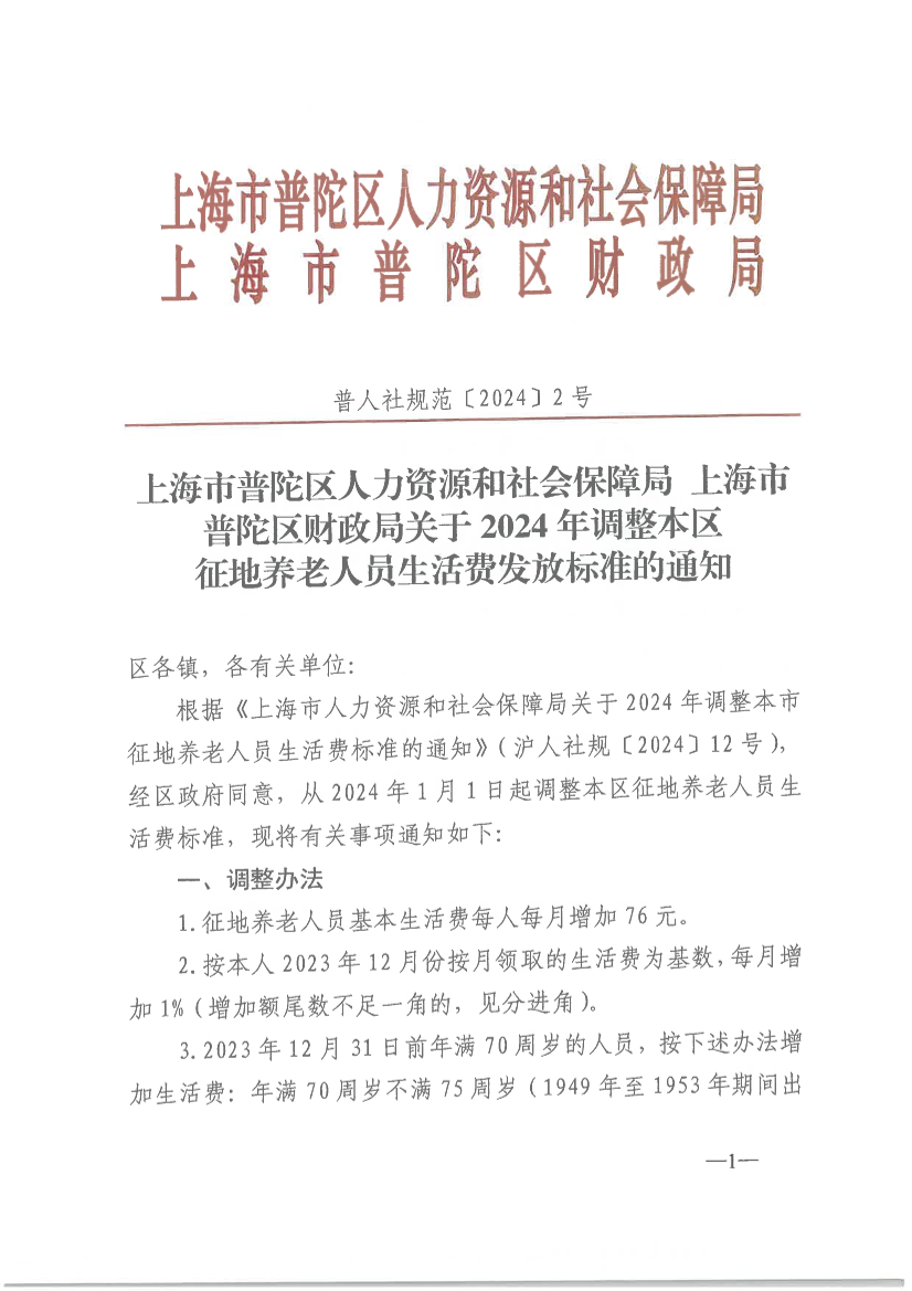 ??根據(jù)《上海市人力資源和社會保障局關(guān)于2024年調(diào)整本市征地養(yǎng)老人員生活費(fèi)標(biāo)準(zhǔn)的通知》(滬人社規(guī)〔2024〕12號),經(jīng)區(qū)政府同意,從2024年1月1日起調(diào)整本區(qū)征地養(yǎng)老人員生活費(fèi)標(biāo)準(zhǔn),現(xiàn)將有關(guān)事項(xiàng)通知如下: