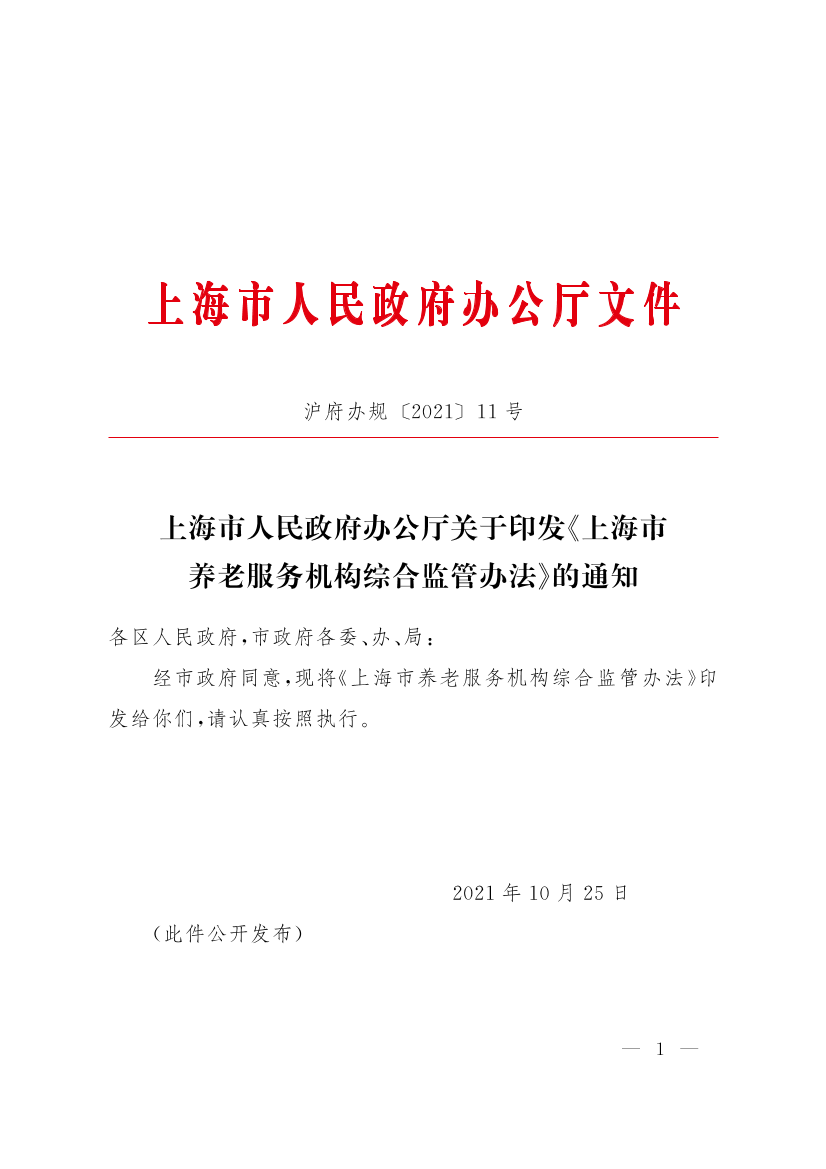 ??經(jīng)市政府同意,現(xiàn)將《上海市養(yǎng)老服務(wù)機(jī)構(gòu)綜合監(jiān)管辦法》印發(fā)給你們,請(qǐng)認(rèn)真按照?qǐng)?zhí)行。