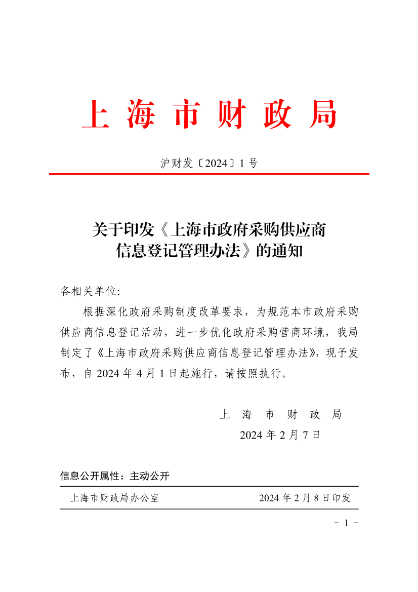 ??根據(jù)深化政府采購制度改革要求,為規(guī)范本市政府采購供應(yīng)商信息登記活動,進一步優(yōu)化政府采購營商環(huán)境,我局制定了《上海市政府采購供應(yīng)商信息登記管理辦法》,現(xiàn)予發(fā)布,自2024年4月1日起施行,請按照執(zhí)行。