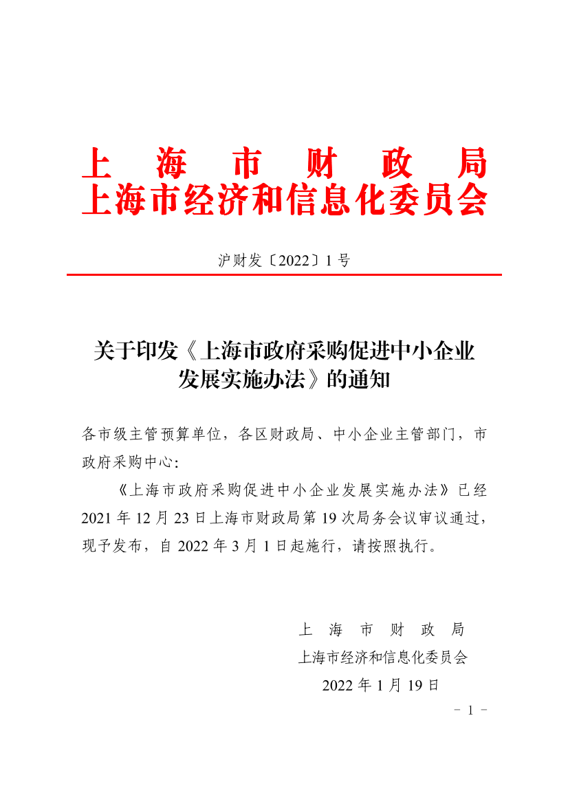 《上海市政府采購促進(jìn)中小企業(yè)發(fā)展實施辦法》已經(jīng)2021年12月23日上海市財政局第19次局務(wù)會議審議通過,現(xiàn)予發(fā)布,自2022年3月1日起施行,請按照執(zhí)行。