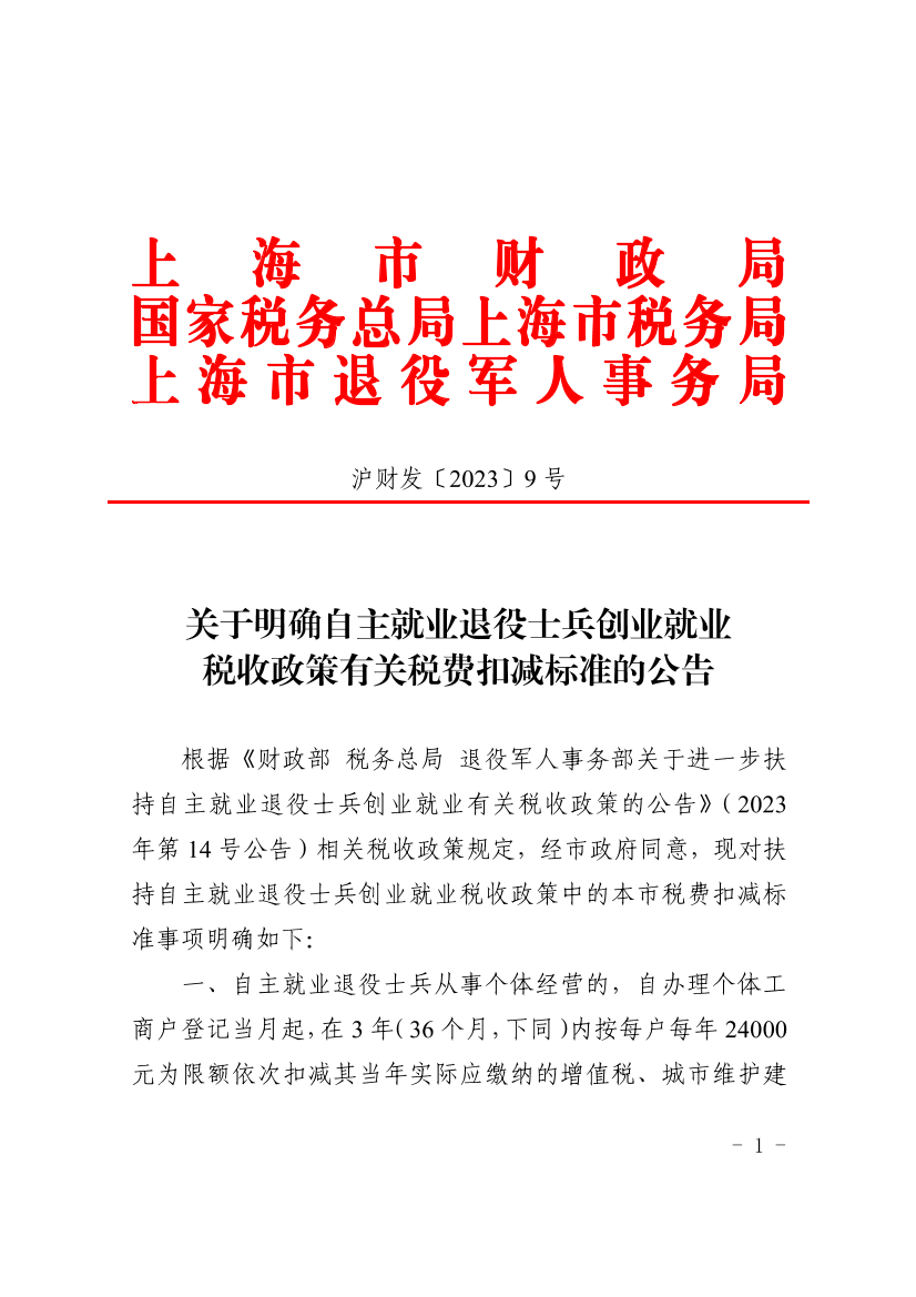 ??根據(jù)《財政部 稅務(wù)總局 退役軍人事務(wù)部關(guān)于進(jìn)一步扶持自主就業(yè)退役士兵創(chuàng)業(yè)就業(yè)有關(guān)稅收政策的公告》(2023年第14號公告)相關(guān)稅收政策規(guī)定,經(jīng)市政府同意,現(xiàn)對扶持自主就業(yè)退役士兵創(chuàng)業(yè)就業(yè)稅收政策中的本市稅費(fèi)扣減標(biāo)準(zhǔn)事項明確如下: