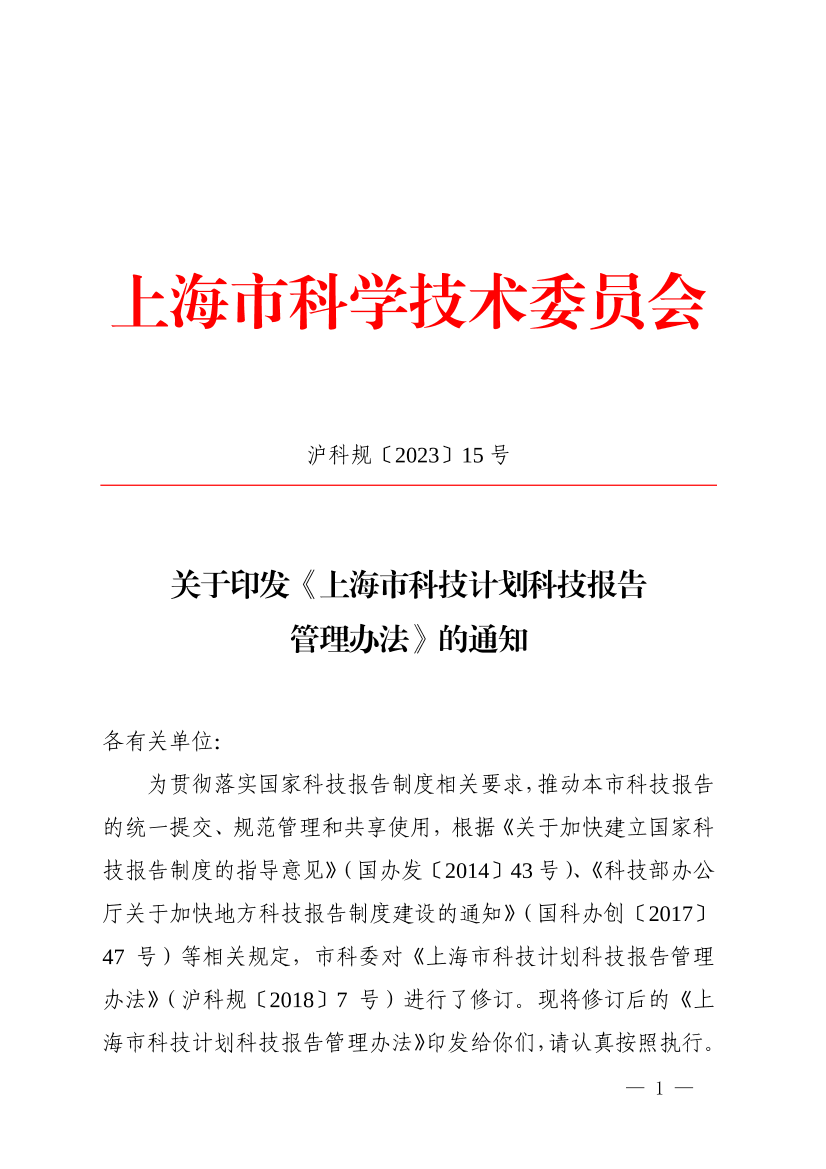 ??為貫徹落實國家科技報告制度相關(guān)要求,推動本市科技報告的統(tǒng)一提交、規(guī)范管理和共享使用,根據(jù)《關(guān)于加快建立國家科技報告制度的指導(dǎo)意見》(國辦發(fā)〔2014〕43號)、《科技部辦公廳關(guān)于加快地方科技報告制度建設(shè)的通知》(國科辦創(chuàng)〔2017〕47號)等相關(guān)規(guī)定,市科委對《上海市科技計劃科技報告管理辦法》(滬科規(guī)〔2018〕7號)進(jìn)行了修訂?,F(xiàn)將修訂后的《上海市科技計劃科技報告管理辦法》印發(fā)給你們,請認(rèn)真按照執(zhí)行。