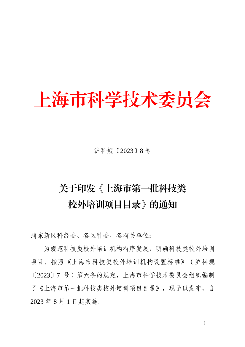關于印發(fā)《上海市第一批科技類校外培訓項目目錄》的通知