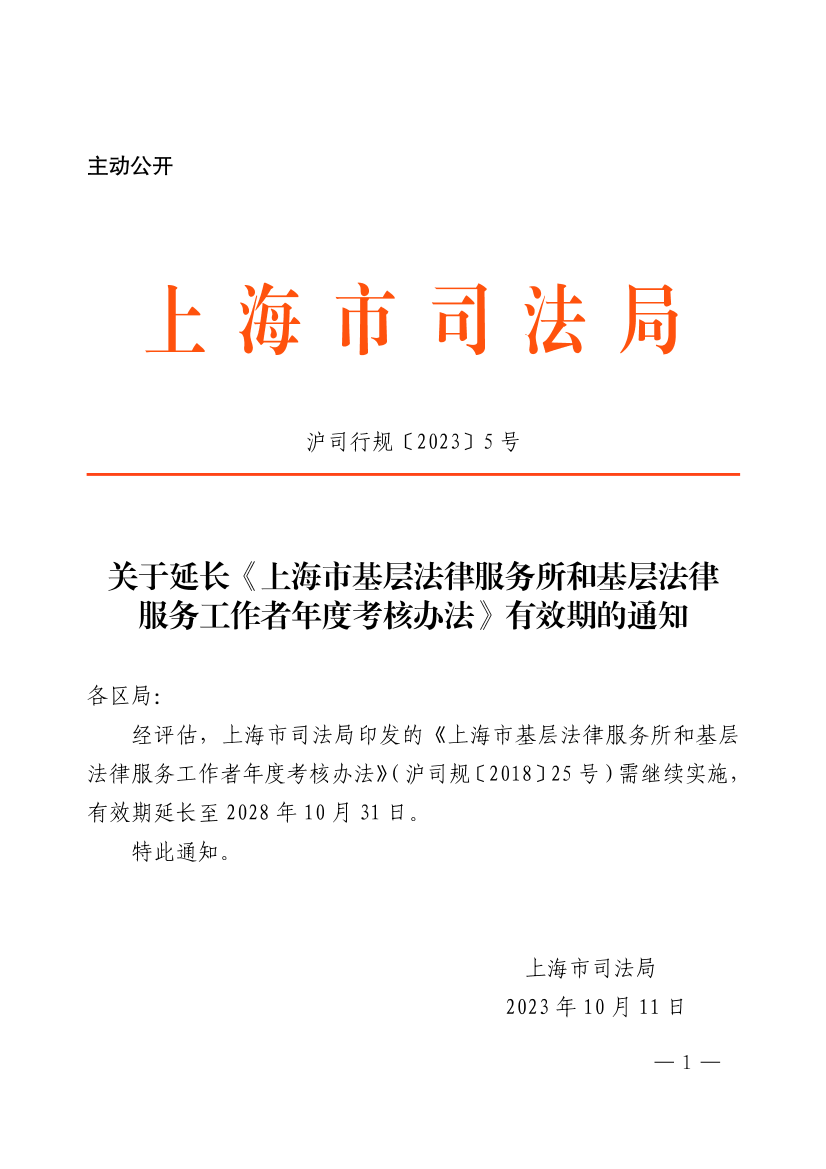 ??經(jīng)評估,上海市司法局印發(fā)的《上海市基層法律服務(wù)所和基層法律服務(wù)工作者年度考核辦法》(滬司規(guī)〔2018〕25號)需繼續(xù)實施,有效期延長至2028年10月31日。